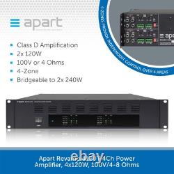 Brand new, factory sealed in original box! The Apart REVAMP4120T is a four channel digital power amplifier offering 4 x 120 watts on 100 volt line.